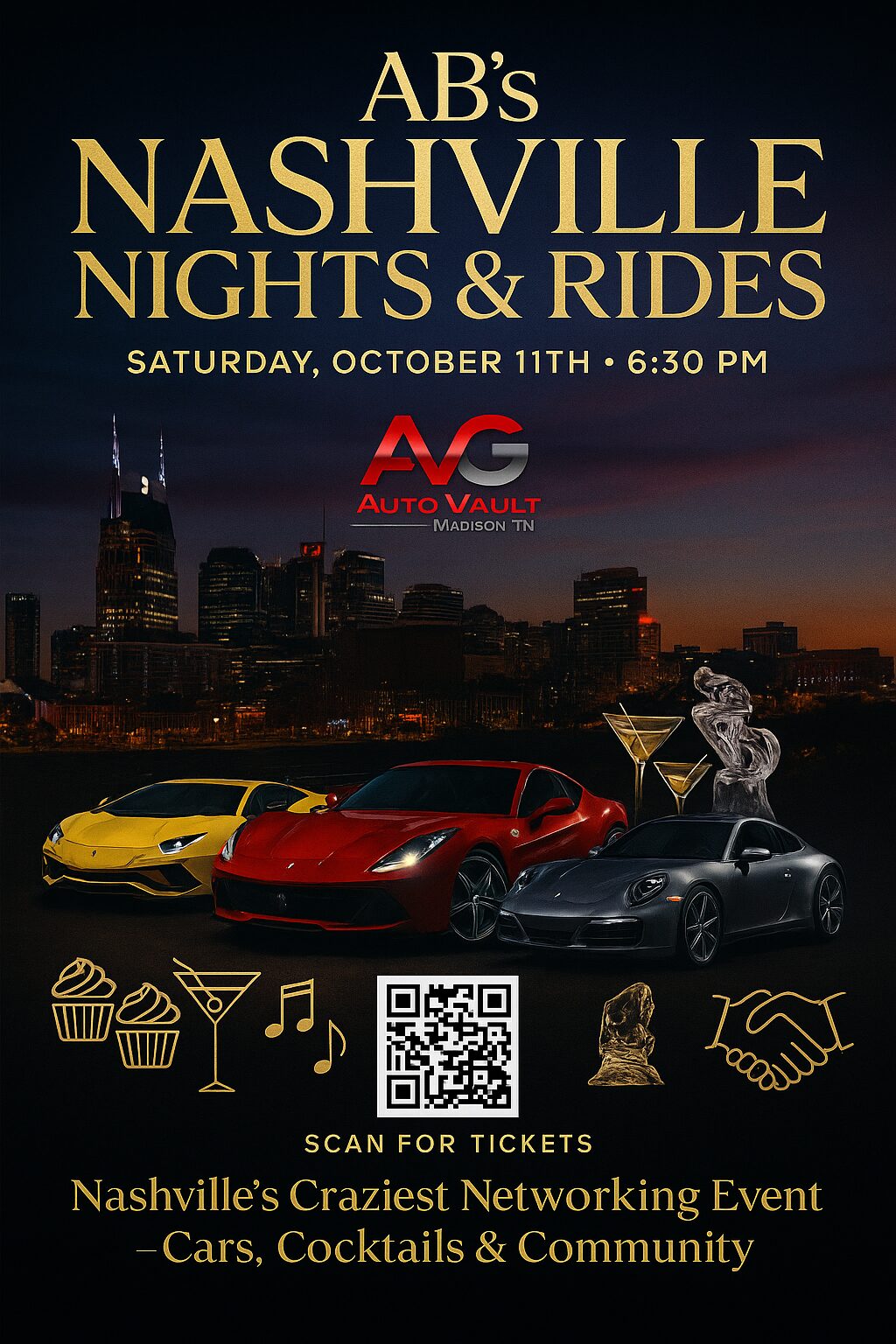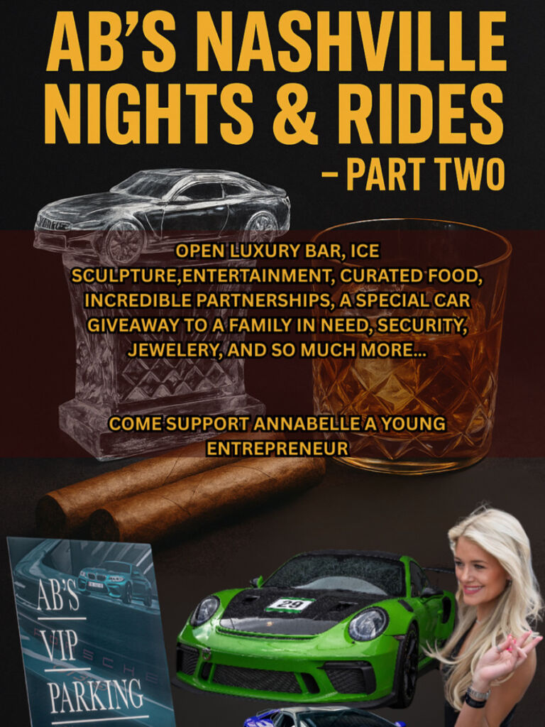 AB’s Nashville Nights & Rides is Nashville’s ultimate night out—where supercars, cocktails, and local luxury collide. Hosted by AB’s Events LLC, this one-night showcase transforms Auto Vault Garage into a high-energy playground of exotic cars, live music, and upscale nightlife. On Saturday, October 11th from 6:30 to 11 pm, guests will mingle with entrepreneurs, car enthusiasts, and tastemakers while enjoying crafted cocktails and curated experiences. Designed to celebrate success and community in a sleek, elevated setting, it’s the premier destination for anyone ready to experience Nashville in full throttle style.